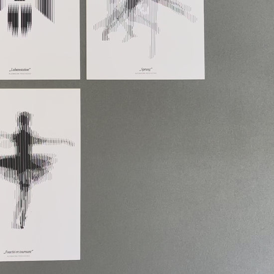 Geschenktipp! Illusionen überraschen immer wieder. Ein Set enthält drei verschiedene Grafiken, die mit einer transparenten beiliegenden Folie animiert werden. Ein Fouetté, einen Sprung und die Labanotation (Ein Zeichensystem, um Choreografien aufzuschreiben). Die Folie wird langsam horizontal und parallel zur Grafik verschoben und der Tanz beginnt.
